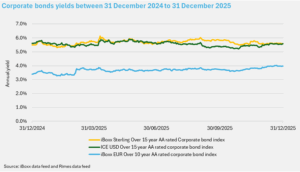The chart below shows the change in the yields on AA-rated Sterling, US Dollar and Euro denominated corporate bonds over the year to 31 December 2025.