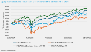 The chart below shows the performance of equity markets in the UK, US, Europe and Japan over the year to 31 December 2025.